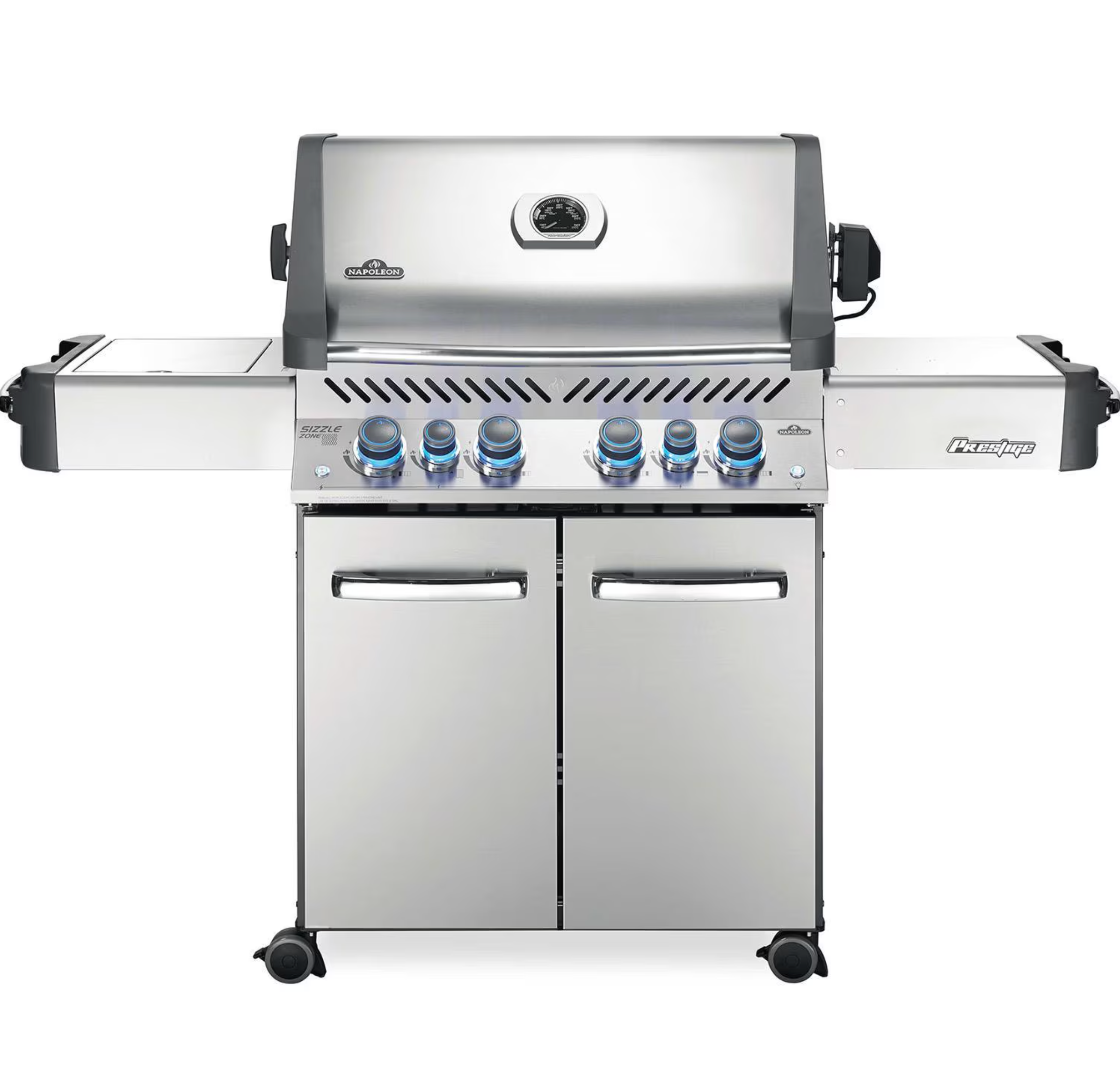 The Napoleon Legacy Prestige 500 blends quality and performance into one package. This freestanding natural gas grill has four stainless steel tube burners that provide up to 48,000 BTUs of cooking power. The grill has stainless steel cooking grates with 500 square inches of main cooking area and 260 square inches across the plated steel warming area for a total of 760 square inches of cooking area. The Napoleon Jetfire ignition with crossover lighting starts each burner individually for a reliable start up every time and allows you to light all the burners at the same time. The stainless steel wave cooking grids create the trademark Napoleon sear lines and allow for better heat retention. The dual level, stainless steel, sear plates vaporize drippings, control flare ups and keep your food moist. This Legacy Prestige 500 also has a 18,000 BTU rear infrared burner and rotisserie kit for roasting and a 14,000 BTU infrared side burner for searing meats. The hood features an Accu-Probe temperature gauge, cast aluminum end caps and retains heat for oven-like performance. The SafetyGlow control knobs turn from blue to red when a burner is in use. Clean up is a cinch with the full width removable drip pan. The stainless steel grill cart features folding shelves with integrated utensil holders, double doors for storage and easy roll locking casters for moving the grill around. This Napoleon grill is manufactured in Canada.