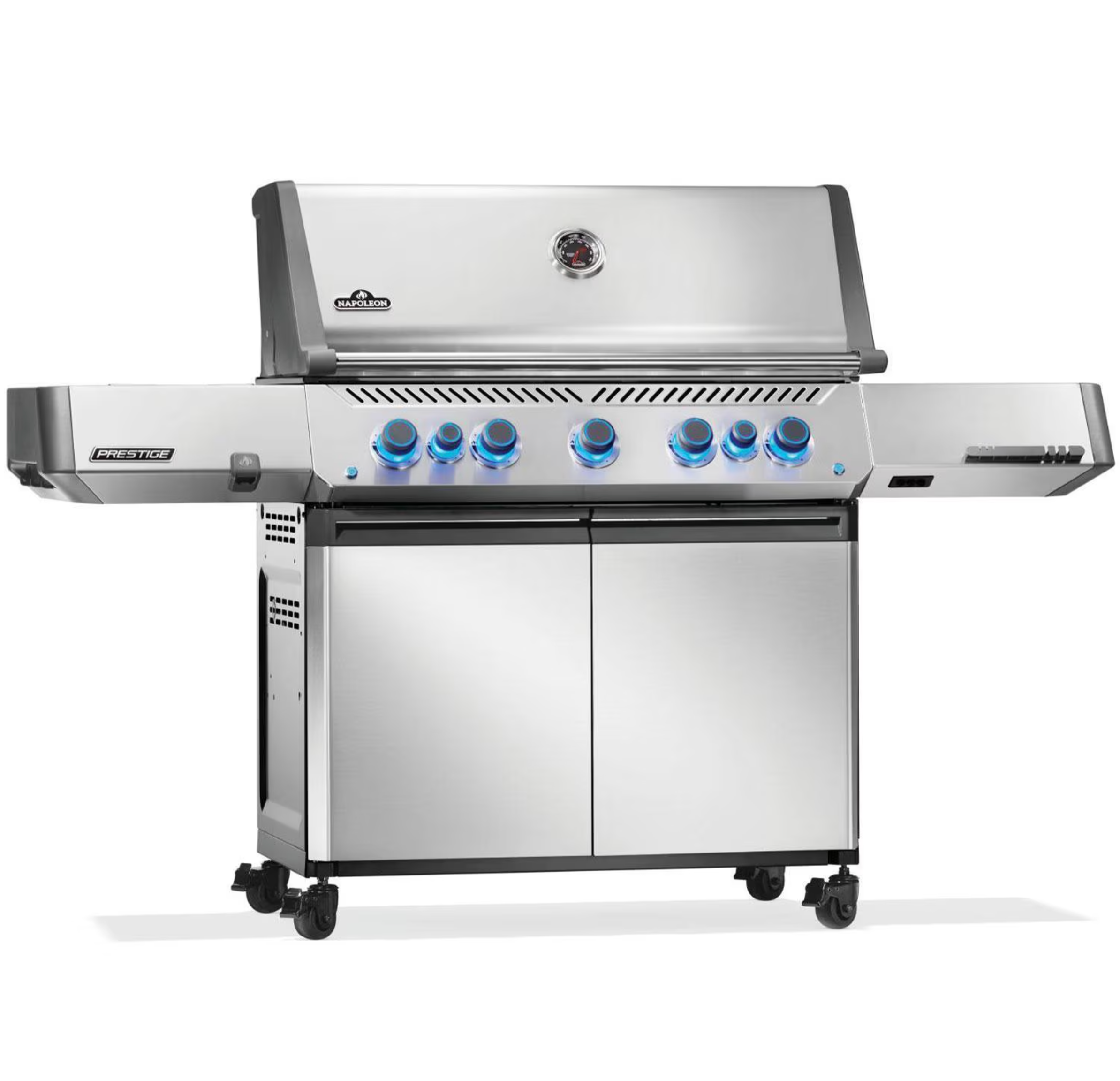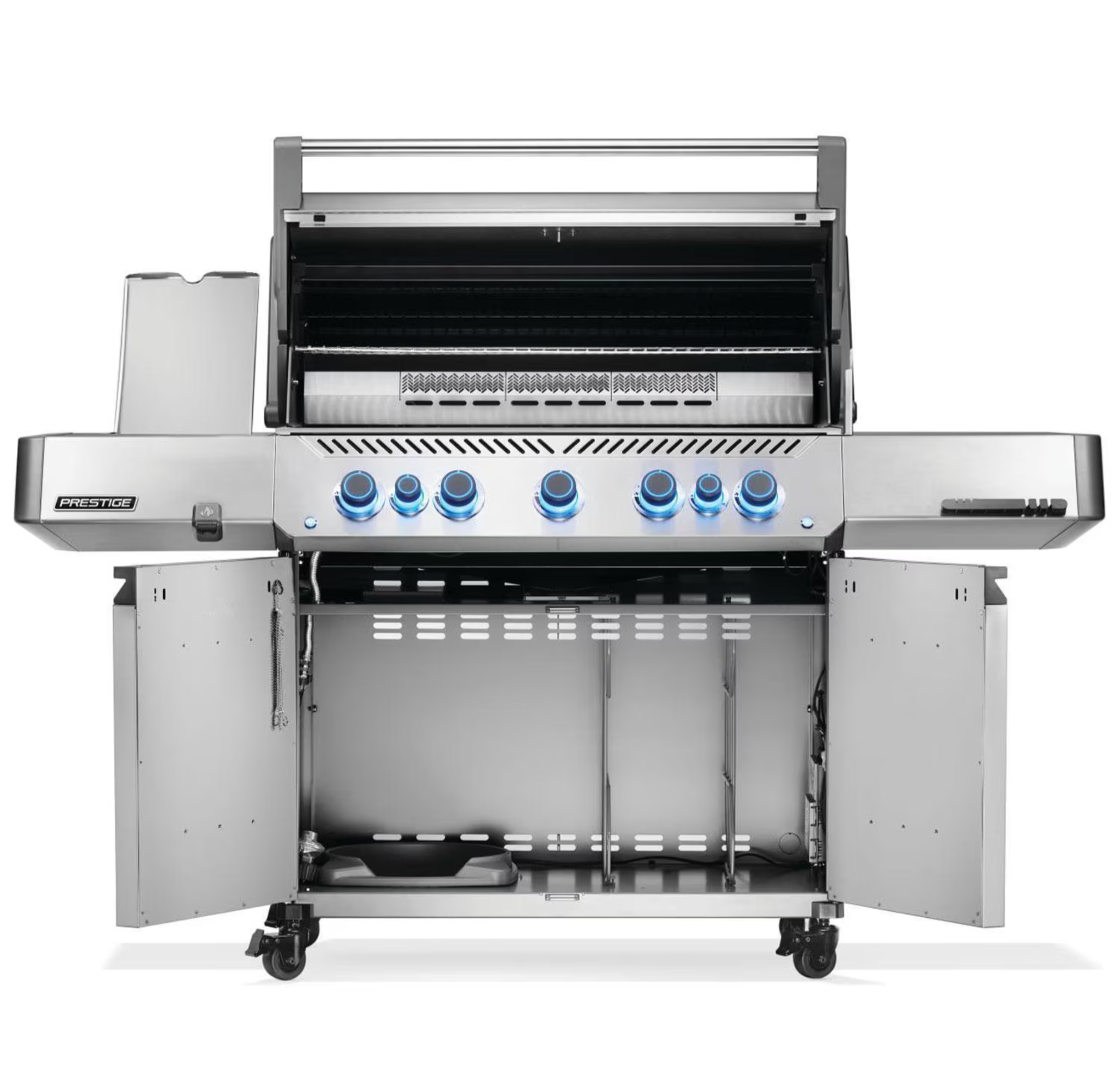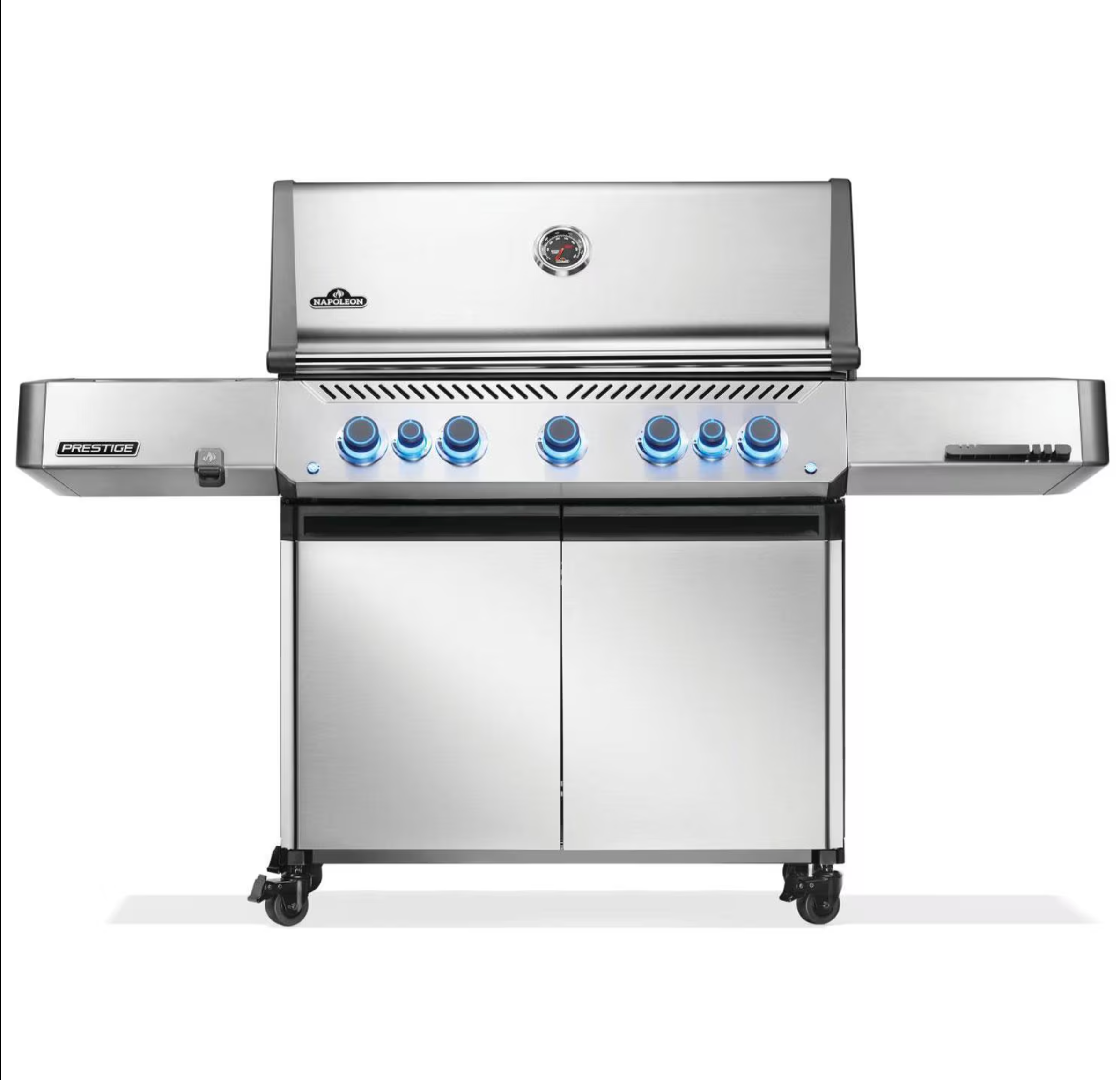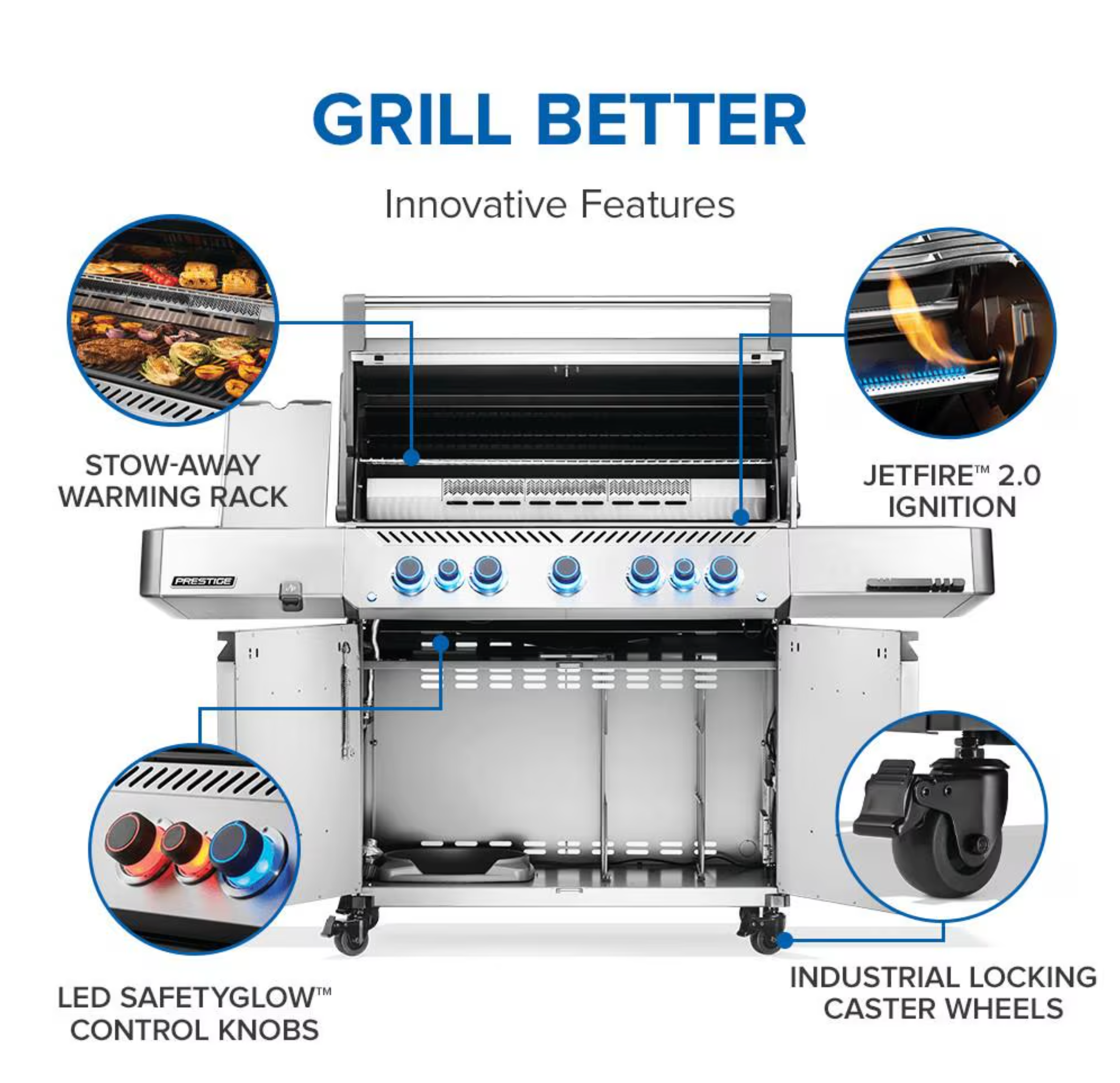 The stainless steel Prestige 665, Natural Gas Grill with Infrared Sde and Rear Burner is a dynamic evolution in grilling that connects you with your grilling experience more than ever before. A larger rotisserie burner and infrared sear station, side burner provide enhanced performance. LED Control Knobs illuminate for nighttime entertaining and feature SafetyGlow, glowing red for added safety when the gas is on. The stow-away warming rack keeps things tidy, and hidden tool hooks provide extra prep space. Enjoy the sleek and modern design and the unique cooking methods you already love with the compelling Prestige 665 Gas Grill.